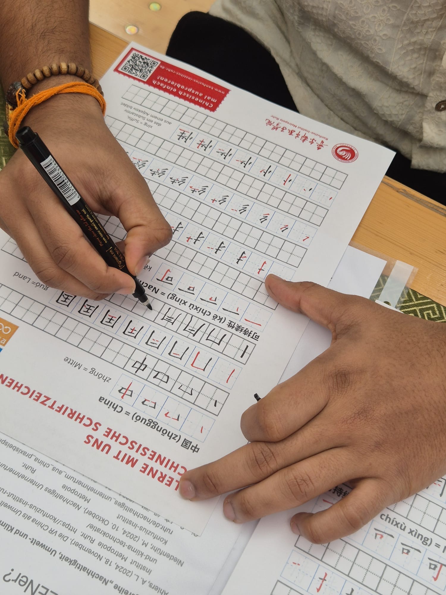 Zwischen aktiven und kulinarischen Entdeckungen gab es auch Gelegenheit, selbst den Kalligrafiestift in die Hand zu nehmen: Mithilfe einer Schriftzeichenvorlage konnten Interessierte chinesische Schriftzeichen sowie die Schriftreihenfolge kennenlernen – darunter Vokabeln, die inhaltlich ganz im Zeichen der Nachhaltigkeit standen.