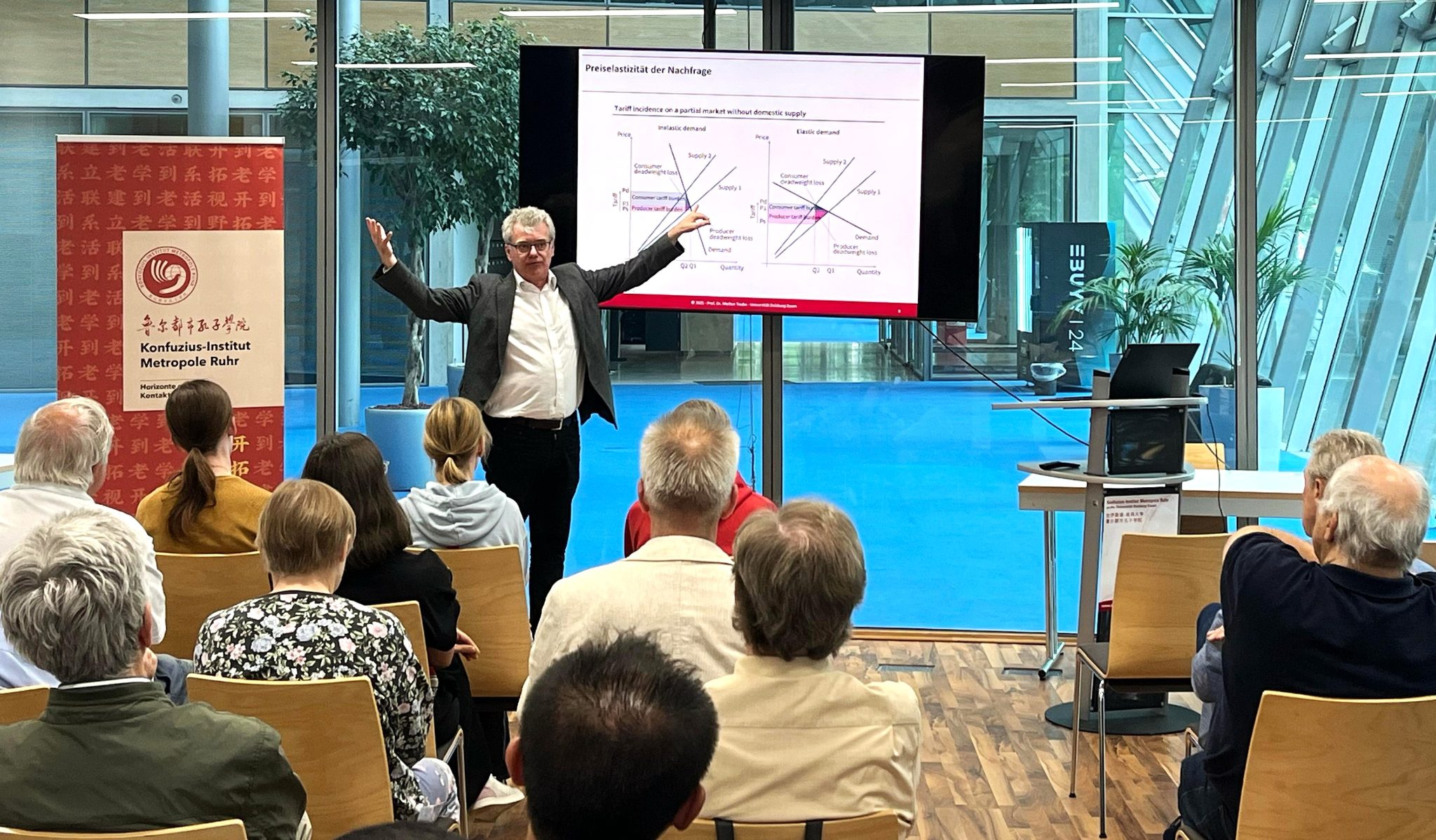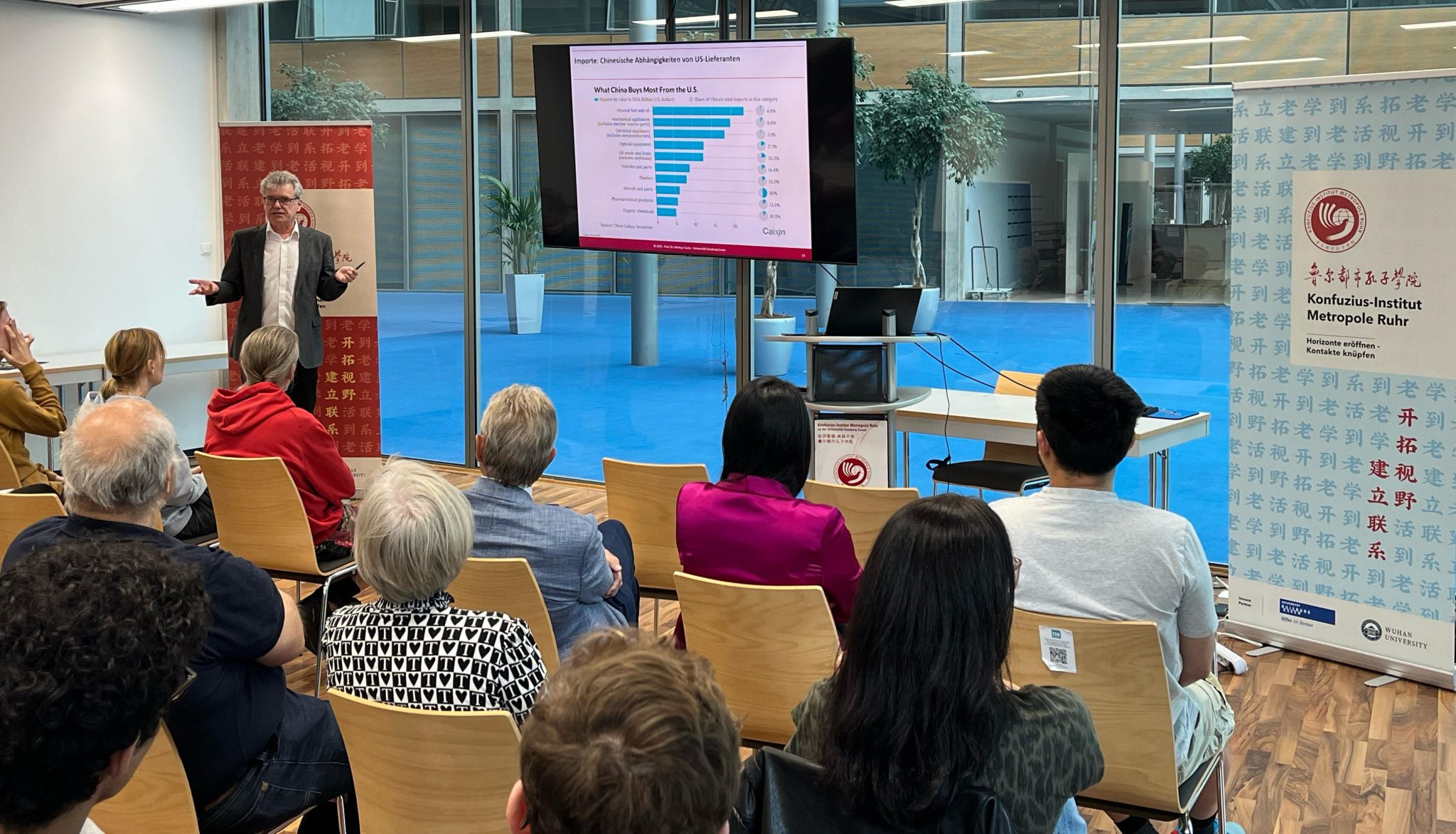 In einem Vortrag am 7. Juli 2025 analysierte Prof. Dr. Markus Taube, Co-Direktor des Konfuzius-Instituts Metropole Ruhr und Inhaber des Lehrstuhls Ostasienwirtschaft / China an der Universität Duisburg-Essen (UDE), den aktuellen Handelskonflikt zwischen China und den USA.